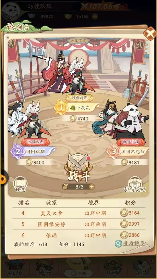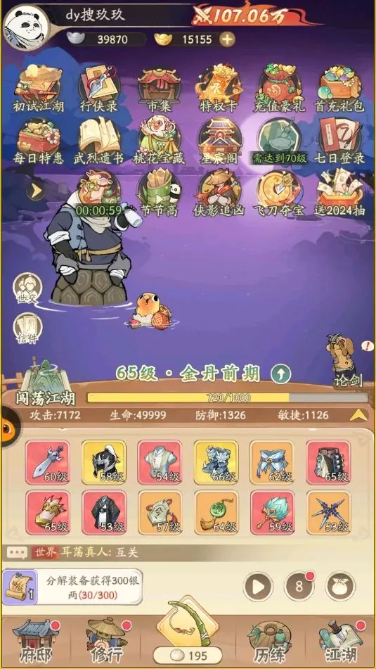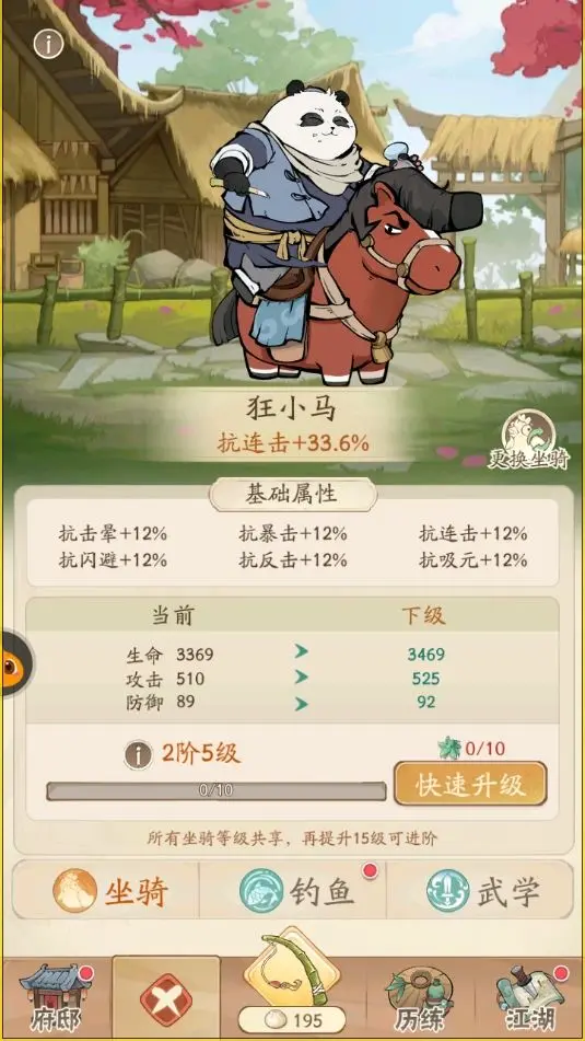 1.刚进入游戏先选择初入江湖的三个角色(熊猫 大鹅 青蛙)任选一个自己喜欢的。 先去做主线任务,跟着新手引导钓鱼掉落装备,高级的装备会附带反击、暴击、吸元、闪避等属性。 前期不需要关注过多属性,只要战力有提升都可以进行替换 随着主线任务的完成,我们会逐渐解锁游戏的各种玩法。 2.论剑(pvp) 消耗战书和别的玩家进行对战,获胜可获得七叶草、银两等奖励。战书在垂钓/习武时随机掉落,也可以在市集消耗元宝进行购买每日/每周根据排名和进行奖励结算,排名越靠前结算的奖励则越多。每周排名奖励会掉落坐骑进阶所需的稀有材料甘露,因此我们一定要多多关注周排名的提升 3.坐骑 除初始坐骑之外每一个坐骑都有着不同的抗性加成,我们可以消耗七叶草来进行坐骑的升级,升到一定等级后需要消耗甘露来进行进阶。解锁新的坐骑需要消耗元宝,建议全部解锁,所有的坐骑可以共享养成等级~坐骑大礼包12元可以解锁全部坐骑,如果已经解锁也通过购买礼包返还元宝,返比例超级高,小氪玩家必冲!建议每日典礼商店的甘露全部买满 4.镖局 镖局每日特定时间都会自动刷新出不同道具,大家可以通过派遣镖师(小鸡)采集资源,如果元宝充足建议玩家雇佣5只